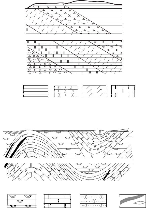 К опасным условиям строительства тоннеля относятся складчатые структуры, представленные антиклинальными и синклиналь нами складками (рис. 9). В местах перегиба слоев, в силу растягивающих напряжений, породы характеризуются повышенной трещиноватостью и обводненностью. Если тоннель пересекает осадочные породы хемогенного генезиса, такие как каменная соль, гипс, доломит, необходимо учитывать возможное наличие в них пустот (карст соляной, сульфатный, карбонатный).