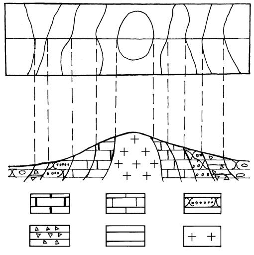 Примеры построения схематического разреза по геологической карте приведены на рис. 10, 11, 12.