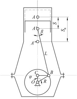 кривошипа, BA равен длине шатуна L, а угол поворота коленчатого вала