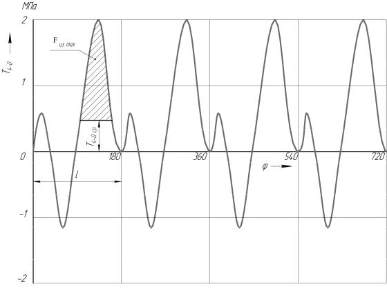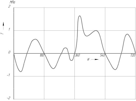 На рис. 8.1 показано изменение удельной силы Т в зависимости от φ. График построен по данным теплового расчета и расчета удельных сил, действующим в КШМ.