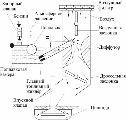 Следует отметить, что уровень топлива в поплавковой камере несколько ниже, чем сечение диффузора, в котором топливо поступает в воздушный поток (величина Н). В связи с этим топливо не может са-