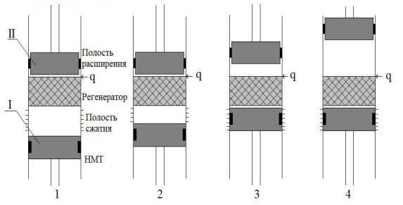 Один из объёмов, расположенный между регенератором и поршнем, представляет полость сжатия, охлаждаемую, например, оребренной поверхностью цилиндра до температуры Тmin. Данный поршень назовем вытеснителем. Другой объем представляет полость расширения, находящуюся при высокой температуре Tmax, к которой постоянно подводится теплота. Поршень, расположенный в данной полости, назовем рабочим.