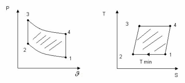 4 1. Охлаждение. Оба поршня движутся вниз. Объём между ними остаётся неизменным. Рабочее тело из полости расширения перемещается в полость сжатия. Проходя через регенератор, рабочее тело охлаждается от Тmax до Tmin, отдавая теплоту регенератору, которая будет передана рабочему телу в процессе 2 3 следующего цикла. Площади диаграмм в координатах P- и T-S представляют собой работу за цикл (рис. 16.2). В координатах Р- и Т-S цикл состоит из двух изотерм и двух изохор.