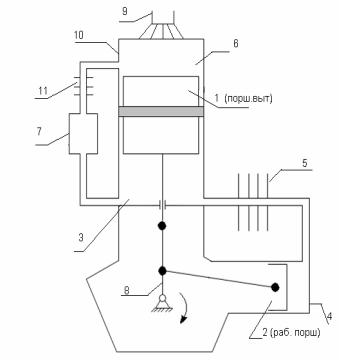 Рабочее тело находится в полости А между верхним рабочим поршнем и головкой цилиндра и в полости Б между поршнями, а в процессе перемещения поршней оно проходит холодильник 3, регенератор 4 и теплообменник-нагреватель 6, где воспринимает теплоту продуктов сгорания топлива, подаваемого в зону горения форсункой 5. Отходящие газы 8 подогревают воздух, подводимый по каналу 7 к горелке.