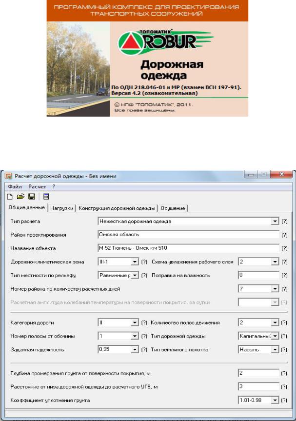 Программа Robur осуществляет расчет дорожной одежды нежесткого типа по ОДН 218.046-2001 [2], учитывая особенности назначения нагрузок по ГОСТ Р 52748 – 2007 [3], и распространяется на проектирование дорожных одежд на вновь сооружаемых дорогах и новых участках реконструируемых дорог.