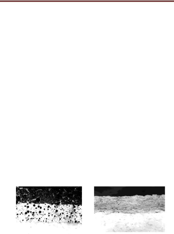 На рисунке 2 А приведено двухслойное покрытие, у которого наружный слой обеспечивает износостойкость детали в эксплуатации, а внутренний слой служит для улучшения сцепления напыляемых материалов с основой. На примере этого же рисунка можно рассмотреть недостатки газопламенного напыления. Эти недостатки связаны с выраженным признаком диффузии напыляемых материалов, что в свою очередь отрицательно отражается на сцеплении слоя с основой. С учетом этого газопламенное напыление не применяют при изготовлении деталей, работающих в условиях знакопеременных, и вибрационных нагрузок, также для изделий с повышенными требованиями по надежности в эксплуатации.