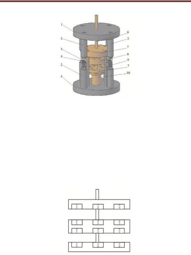 1 – защищаемое основание; 2 – основание для упругого элемента; 3 – упругий элемент (пружины); 4 – дюралюминиевые стойки; 5 – вибрирующее основание; 6 – шток; 7 – дюралюминиевый диск; 8 – якорь;