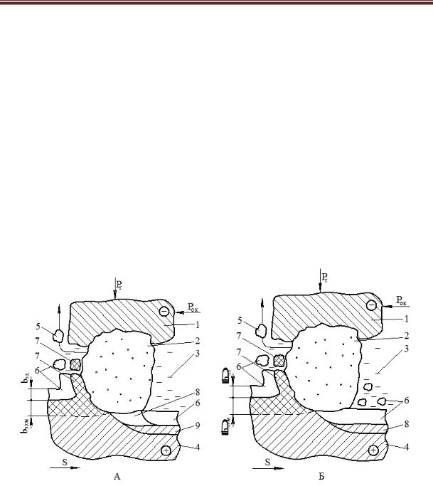 3 – электролит; 4 – обрабатываемое изделие. А – с преобладанием процессов электрохимического и механического съема: 5 – газообразные продукты ЭХ процесса; 6 – твердые продукты, частицы и слои, разрушенные ЭХ процессом; 7 – частицы и слои, разрушенные процессом и резанием; 8 – слой, активированный резанием; 9 – слой изделия, измененный ЭХ шлифованием. Б – с преобладанием процессов электроэрозионного и механического съема: 5 – газообразные продукты ЭЭ процесса;