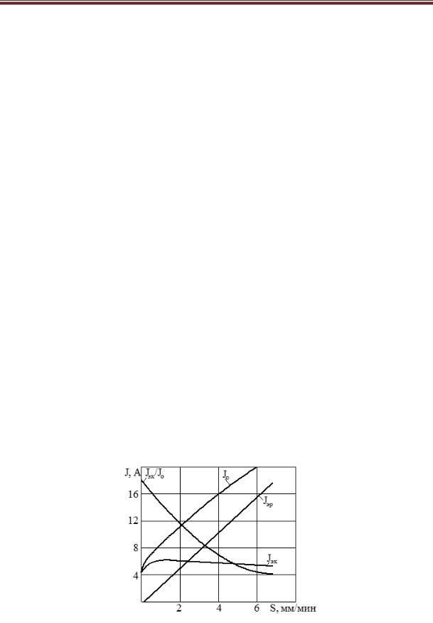 Рис. 3. Графики зависимостей общего Jo, электроэрозионного Jэр и электрохимического Jэх токов от величины подачи на врезание S при электроалмазном шлифовании
