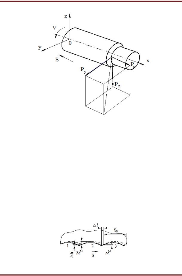 При формировании микропрофиля поверхности под действием контактного давления в зоне обработки происходит пластическое течение металла как в направлении подачи с образованием волны, перемещающейся вместе с инструментом, так и в направлении, противоположном подаче, как это показано на рисунке 4. На схеме пунктиром показано перемещение инструмента в направлении подачи S на величину Sо на один оборот. При этом профиль шара последовательно занимает положения 1, 2, 3 и формируется при этом первичная шероховатость поверхности RZ. Под действием давления инструмента происходит пластичное течение металла в направлении, противоположном направлению подачи с формированием вторичной шероховатости RZ. Такое искажение шероховатости поверхности зависит от величины давления, формы профиля деформирующего инструмента и пластических свойств материала детали.