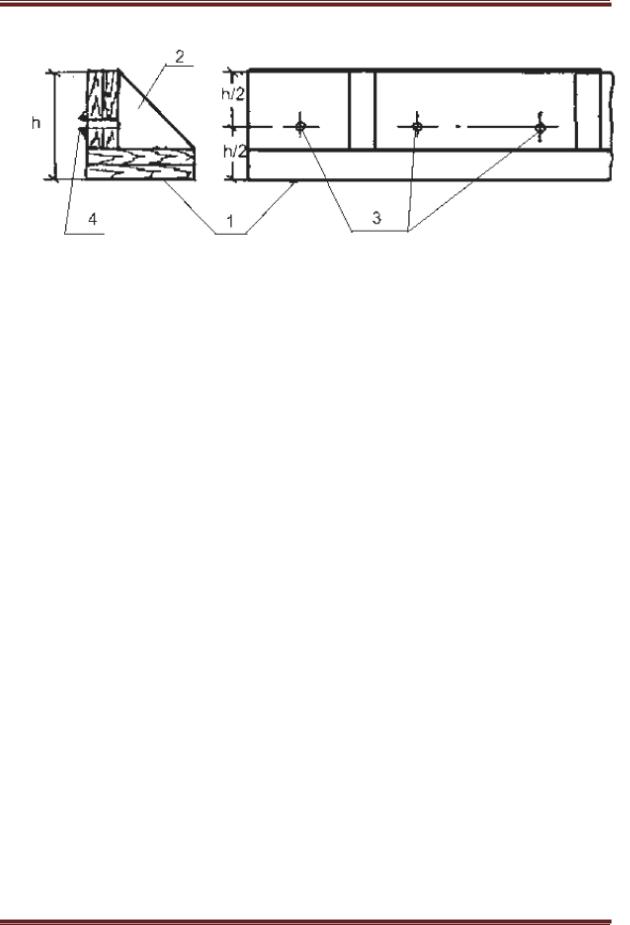 -у места шва удалить бетонную смесь, установит опалубку, обеспечивая совпадение верхней грани вертикальной полки с поверхностью покрытия, закрепить опалубку способом, не допускающим ее смещения и зависящим от типа основания, которое забивают в основание вплотную к горизонтальной полке на расстоянии от 100 до 150 см по длине (рис. 2);