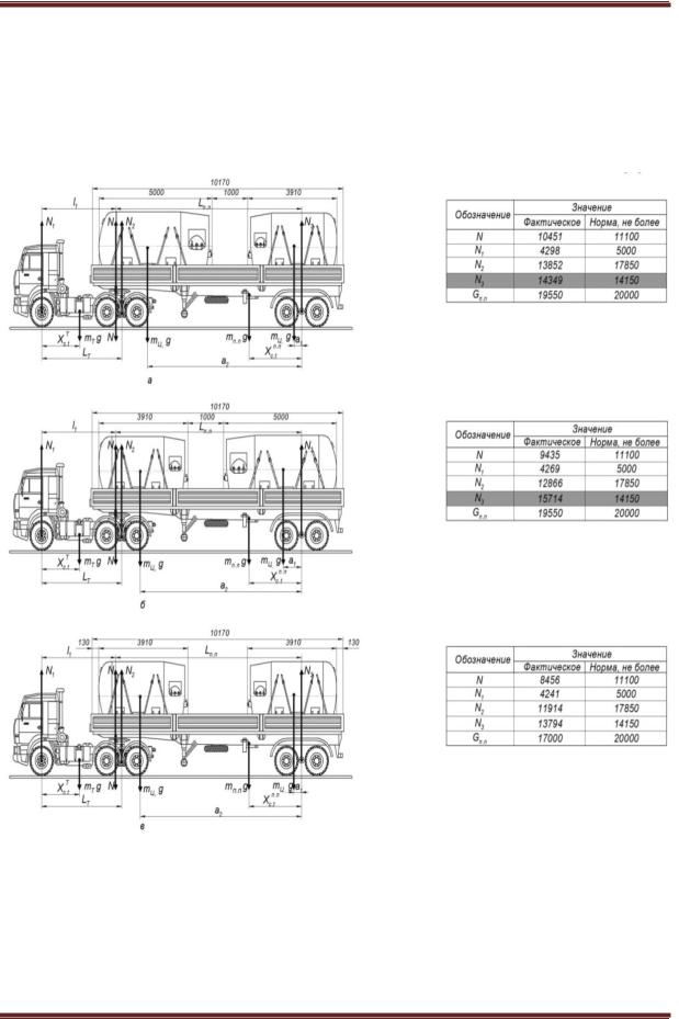 2.Нами был произведен расчет в составе седельного тягача «КамАЗ-65116» и полуприцепа «ОдАЗ-9385», позволяющий определить распределения массы автопоезда в зависимости от размещения переносной цистерны (двух цистерн) в загрузочном пространстве транспортного средства, который показал: