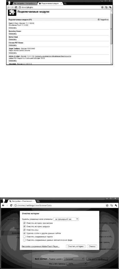 С помощью подключаемых модулей браузером обрабатываются специальные типы веб-содержания, например файлы Flash и Windows Media. Для отключения ненужных нажатием кнопки «Отключить отдельные модули» вызывается диалоговое окно (рис. 1.59), в котором выбираем программы, которые желаем отключить.