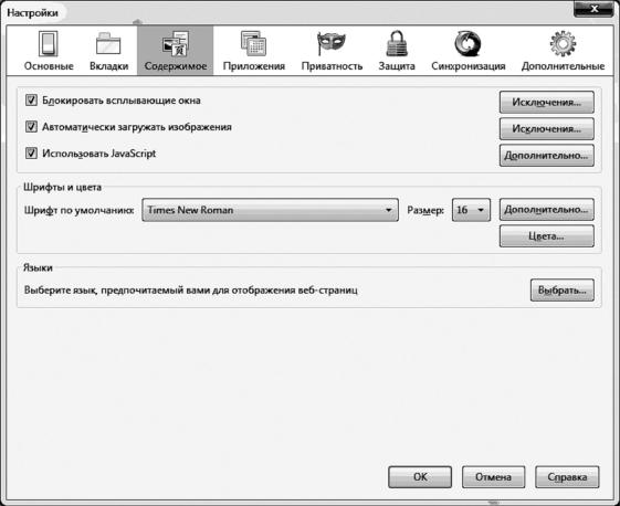 «Блокировать всплывающие окна». По умолчанию Firefox блокирует всплывающие окна на веб-сайтах. Снятие этого флажка отключает блокирование всплывающих окон. Для этого надо нажать кнопку «Исключения», ввести адрес сайта и нажать кнопку «Разрешить». Чтобы удалить веб-сайт из списка, необходимо выбрать его и нажать кнопку «Удалить сайт», чтобы полностью очистить список, – нажать кнопку «Удалить все сайты».