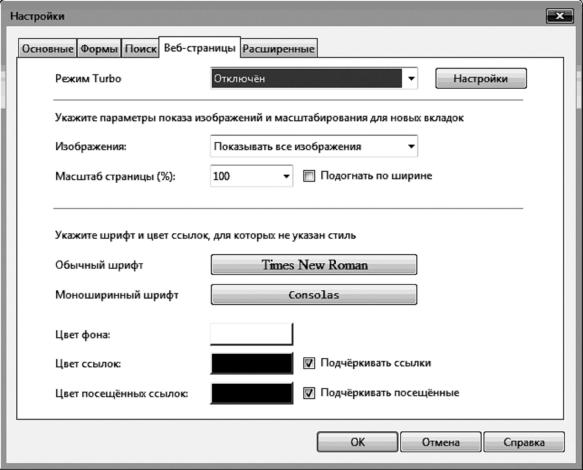 Вдругих полях настраиваются такие пользовательские параметры, как шрифты, цвета фона, ссылок посещенных ссылок, а также возможность выделения ссылок подчеркиванием.