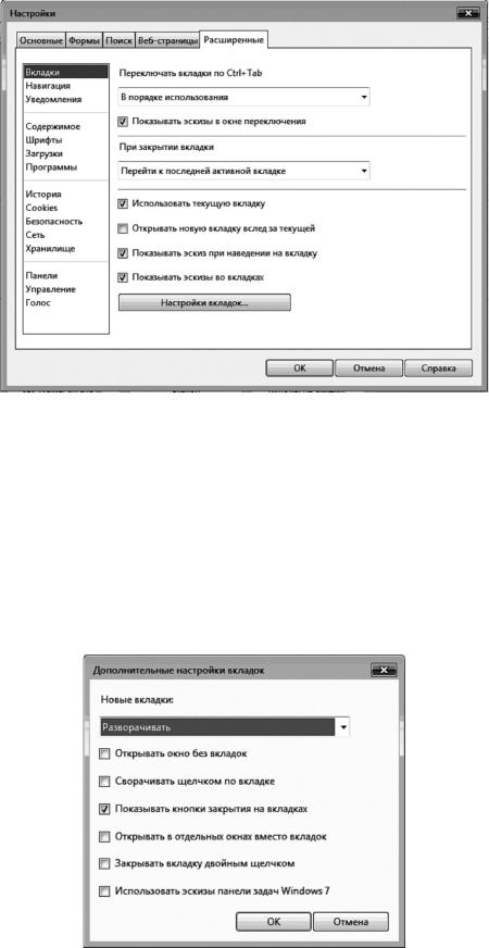 Пункт «Вкладки». Здесь можно настроить переключение по вкладкам с помощью раскрывающегося списка. Также аналогичным способом настраиваются варианты поведения браузера при закрытии вкладки. При нажатии на кнопку «Настройка вкладок» появляется окно с дополнительными настройками вкладок (рис. 1.24).