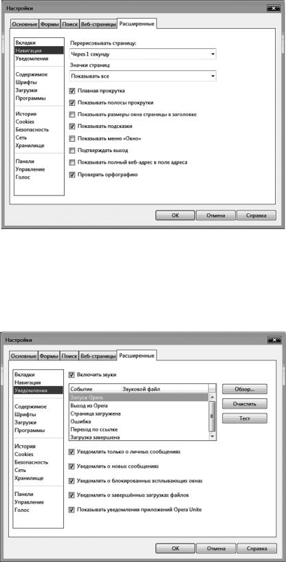 Здесь можно настроить звуки событий, происходящих в браузере. Чтобы выбрать звуковой файл, необходимо нажать кнопку «Обзор», для прослушивания звука – кнопку «Тест», а для удаления звука – кнопку «Очистить». Кроме этого, здесь можно настроить уведомления о различных событиях.