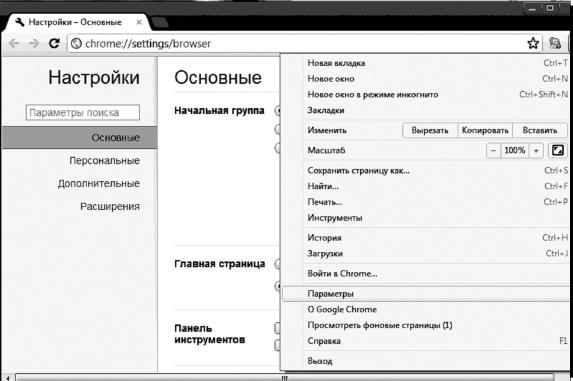 Запускаем браузер Google Chrome. Нажимаем на настройки и управления и выбираем из списка параметры (рис. 1.40).
