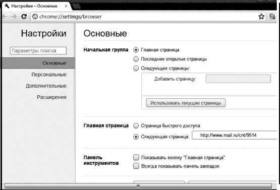Для начала рассмотрим действия браузера при запуске, а именно разделы «Начальная группа» (рис. 1.41).