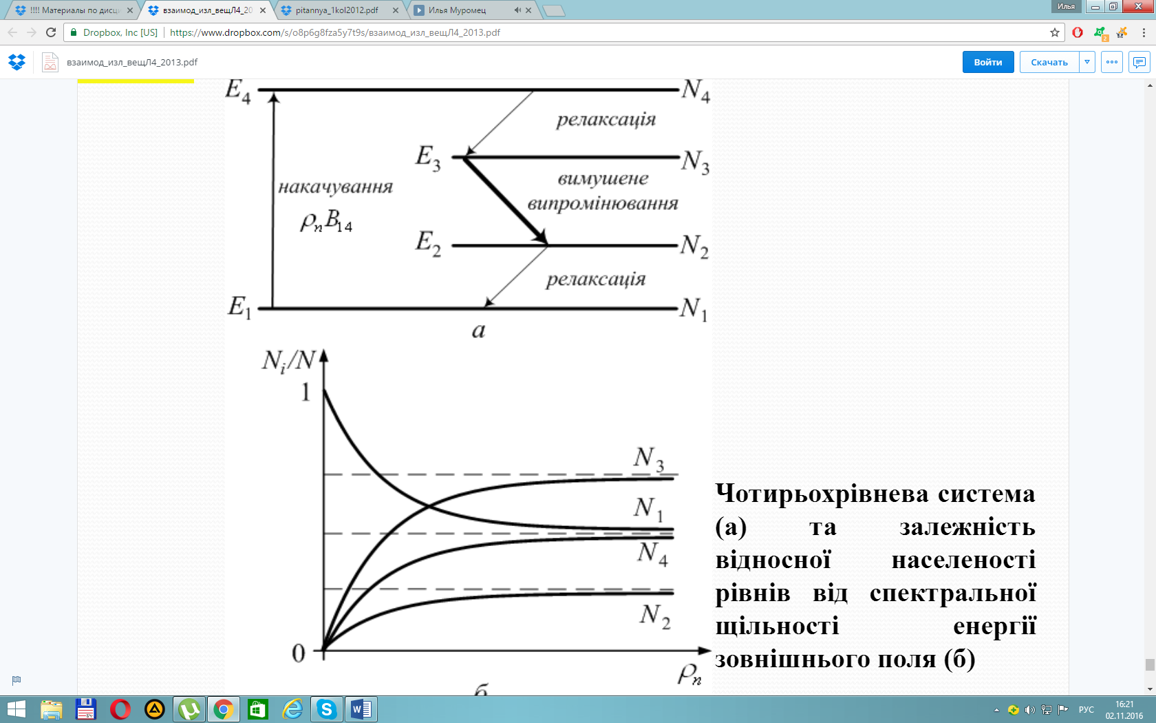 За рахунок iнтенсивних вимушених переходiв з випромiнюванням у каналi генерацiї 3 ↔ 2 значення N3 буде зменшуватися, а N2 – зростати, приводячи до насичення коефiцiєнта пiдсилення. Необхiдно зазначити деякi моменти, що належать як до три- рiвневих схем, так i до чотирирiвневих. 1. Для виключення термiчного виродження необхiдно, щоб енергетичнi вiдстанi мiж рiвнями E4 − E3 i E2 − E1 були бiльшi за kT. Однак вони не повиннi бути занадто великими, оскiльки в протилежному випадку бiльша частина енергiї накачування ви- трачатиметься даремно. Це призведе до зменшення ККД у межах η < E3−E2 E4−E1 i розiгрiвання активної речовини, або до випадку коли надлишкова енергiя при релаксацiйних процесах видiлятиметься у виглядi тепла. 2. При оптичному накачуваннi, коли джерело накачування випромiнює в широкiй областi спектра, необхiдно, щоб верхнiй рiвень E4 був достатньо широким. Це необхiдно для бiльш повного використання енергiї накачування. 3. Для виключення самопоглинання, що призводить до переходiв E1 → E2 i E3 → E2, бажано, щоб релаксацiйнi процеси вiдбувалися за рахунок неоптичних безвипромiнювальних переходiв. 4. Час життя на верхньому лазерному рiвнi E3 повинен визначатися випромiнювальними процесами, а ймовiрнiсть безвипромiнювальних переходiв iз цього рiвня має бути мiнiмальною.