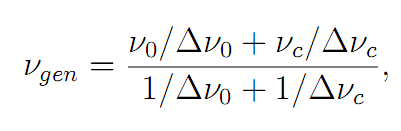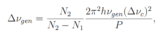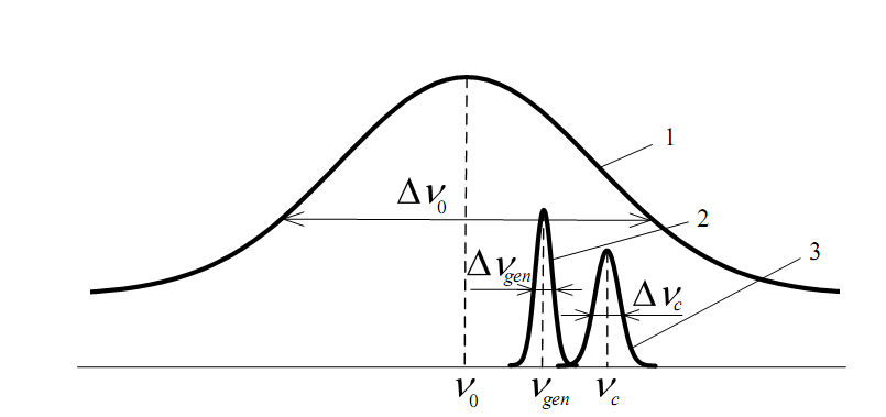Спектр вихідного випромінювання має лоренцевий контур, а його напівширина визначається формулою Шавалова і Таунса: