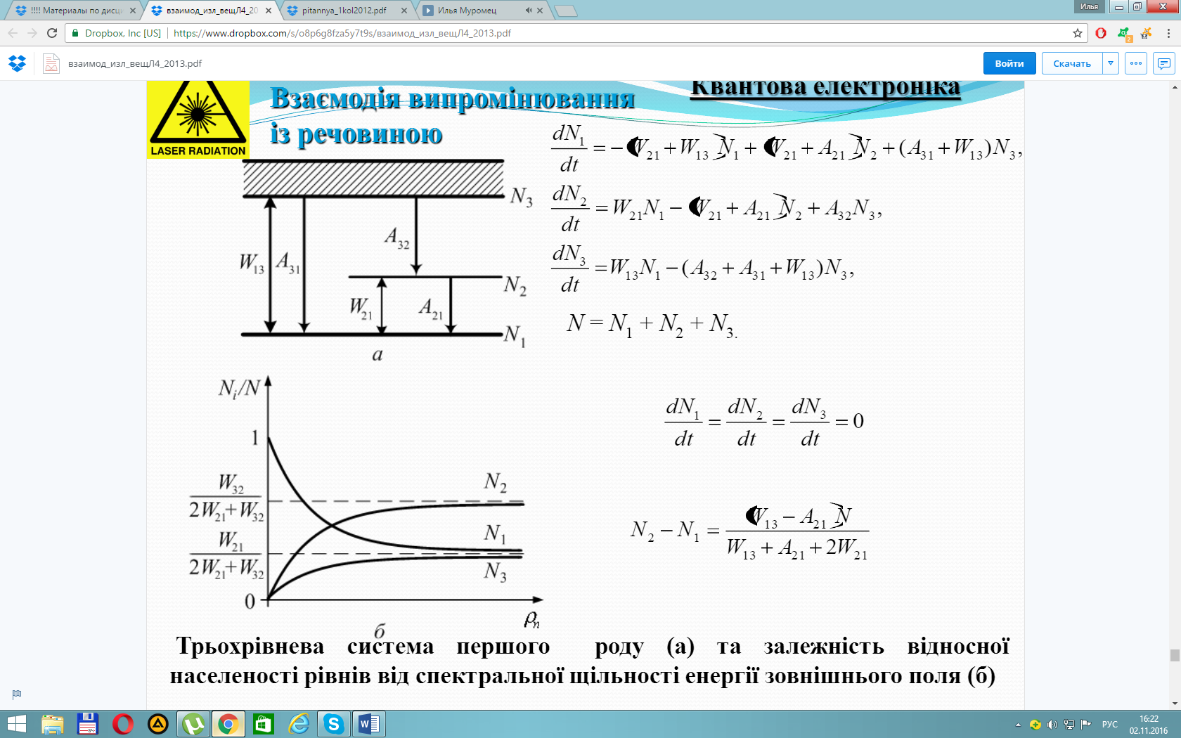 У трирiвневiй системi можна досягти iнверсiй- ну заселенiсть мiж рiвнями 2 та 1 за умови, що ω32 > ω21 та гу- стина випромiнювання накачування перевищить порогове зна- чення, при якому N2 = N1.