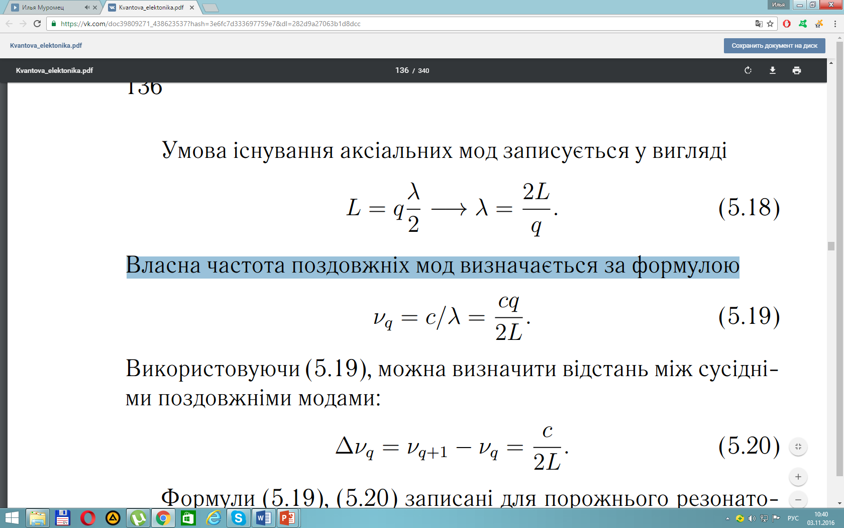 Якщо хвилi поширюються вздовж осi резонатора, то утворяться поздовжнi моди, їх власна частота у порожньому резонаторi визначається за формулою