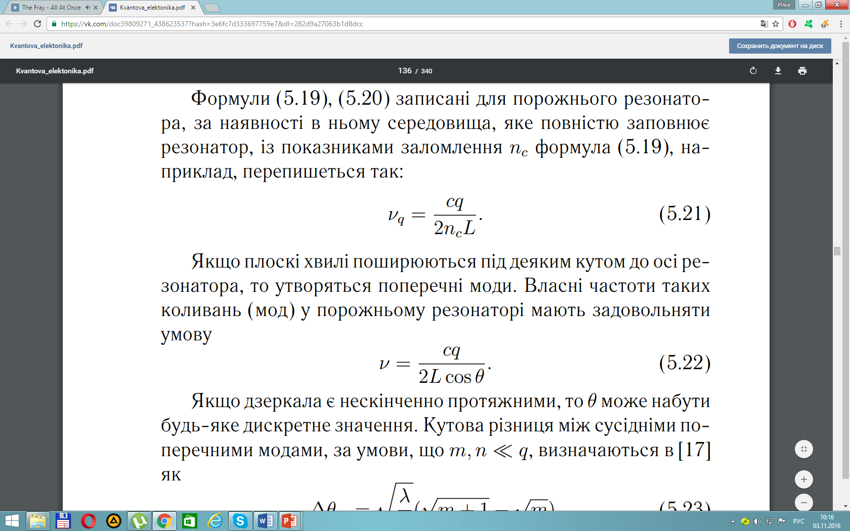 Якщо плоскi хвилi поширюються пiд деяким кутом до осi резонатора, то утворяться поперечнi моди. Власнi частоти таких коливань (мод) у порожньому резонаторi мають задовольняти умову