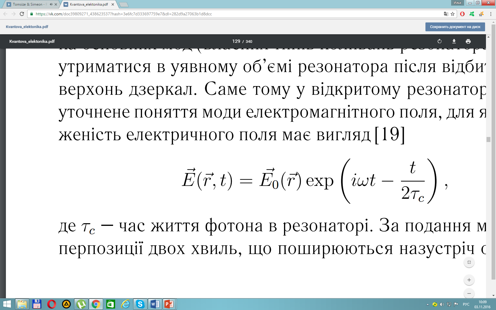 Теоретичне дослідження електромагнітного поля в резонаторі показало, що його можна представити у вигляді подовжньої й поперечної структури й розкласти в ряд за деякою системою функцій хвильових рівнянь, що мають індекси m,n,q однозначно пов'язаних з певною системою координат. Кожний доданок цього ряду вiдповiдає типу коливань - модi T EMm,n ,q (transverse electromagnetic). Розрiзняють поздовжнi, або основнi, моди з iндексами 0, 0, q (T EM0,0 ,q) та поперечнi моди T EMm,n. Для малих значень m i n типи коливань, що утворенi хвилями, якi поширюються пiд малими кутами θ, дифракцiйнi втрати малi. Поле цих типiв коливань швидко спадає на краях дзеркал резонатора. Для бiль- ших значень iндексiв m, n > 7, дифракцiйнi втрати рiзко зростають. m, n вiдповiдають кiлькостi змiни напрямку поля на поверхнi дзеркал. Або iншими слова- ми – кiлькостi нулiв поля всерединi загальної плями поля на поверхнi дзеркала, виключаючи нулi поля на краях плями. Індекси m,n,q для кожного коливання відповідають кількості півхвиль, які укладаються в напрямках координат x,y,z, якщо резонатор прямокутний або по колу і довжині, якщо резонатор круглий.