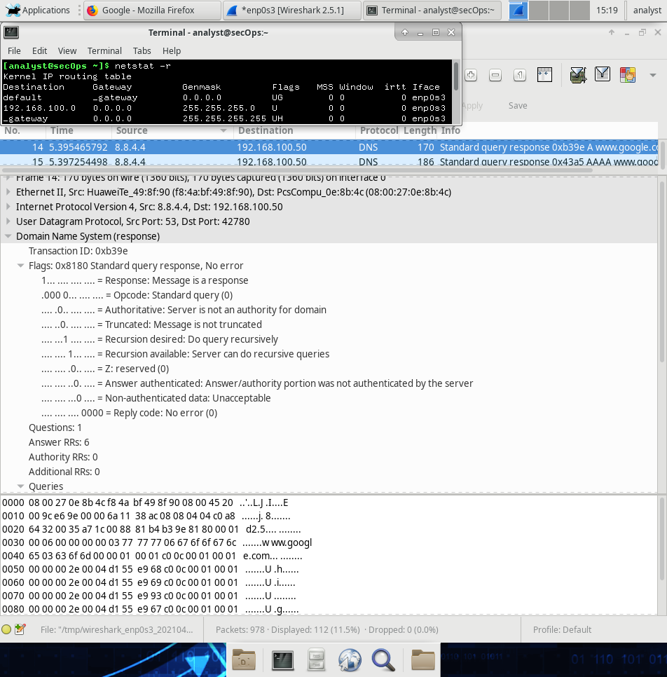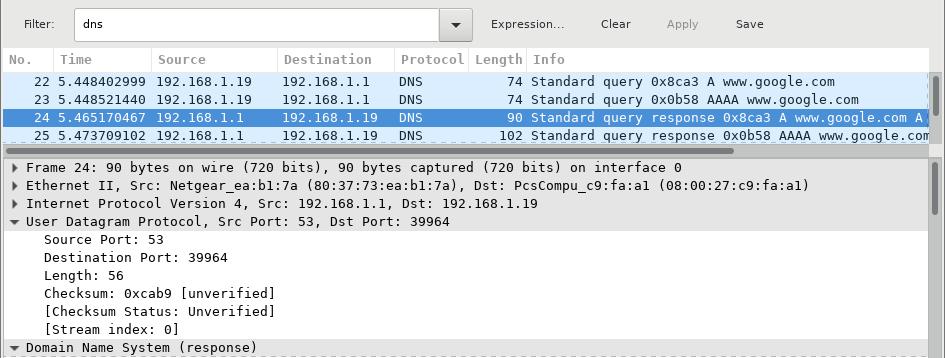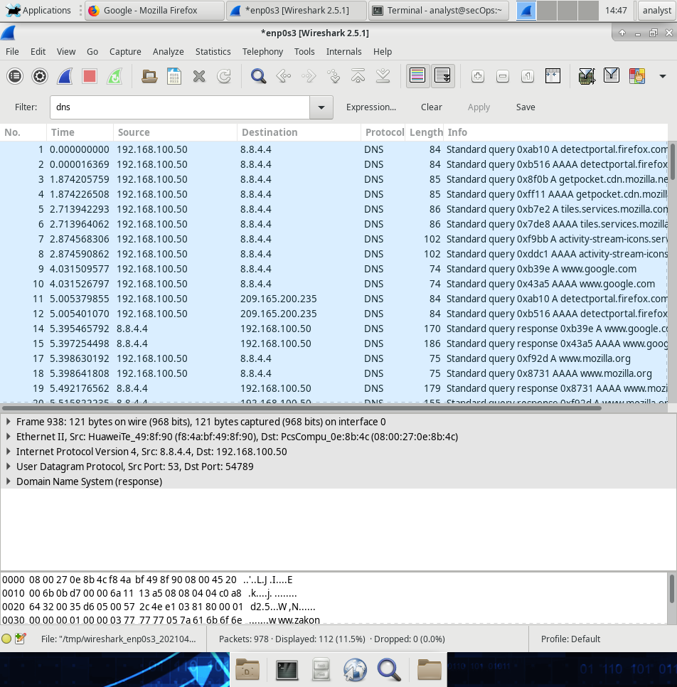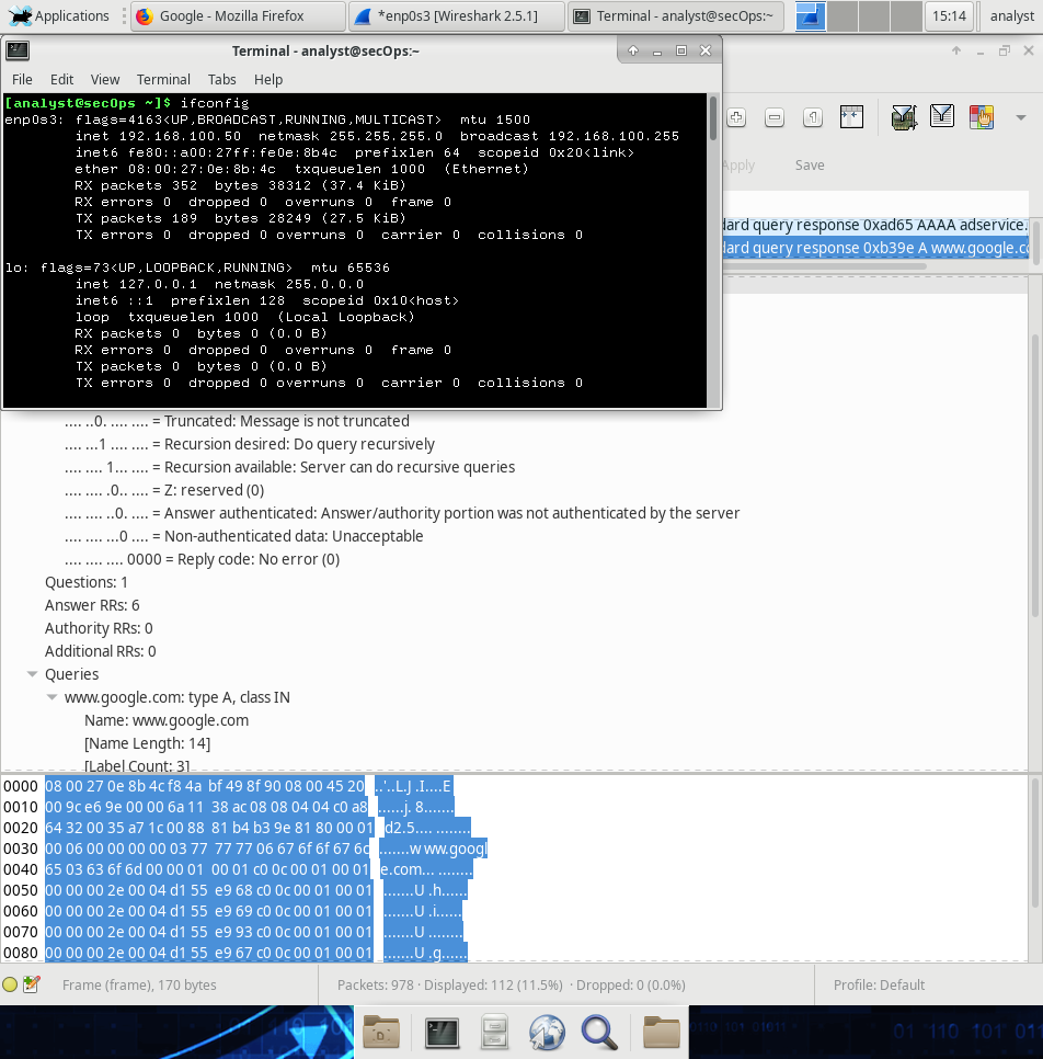 Примечание. Если после применения фильтра DNS вы не видите никаких результатов, закройте веб-обозреватель. В окне терминала введите ping www.google.com в качестве альтернативы браузеру.