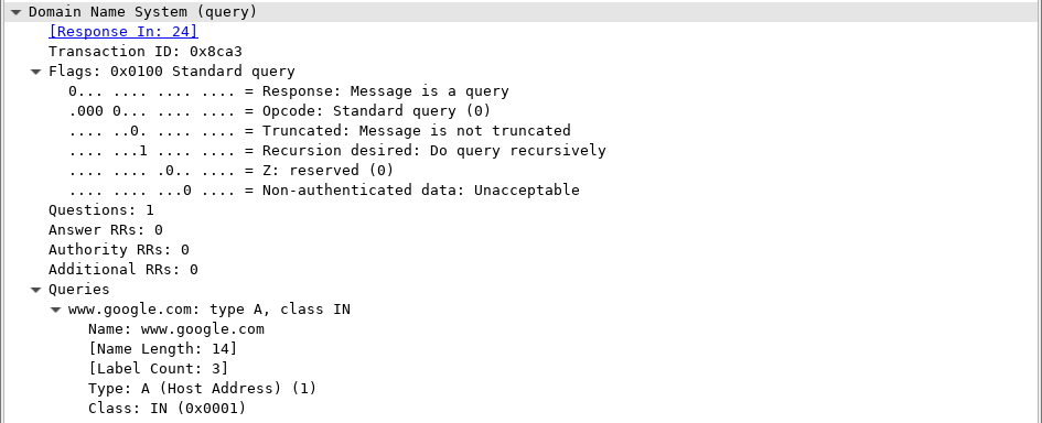 В данном примере соответствующим пакетом DNS-ответа является кадр 24. Обратите внимание на то, что количество байтов во время передачи составляет 90. Этот пакет превышает по объему пакет DNS-запроса. Это связано с тем, что пакет DNS-ответа будет содержать разнообразные сведения о домене.