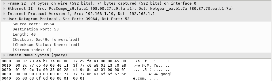 В строке Internet Protocol Version 4 перехваченные программой Wireshark данные IP-пакета показывают, что IP-адрес источника данного DNS-запроса — 192.168.1.19, а IP-адрес назначения — 192.168.1.1. В данном примере адрес назначения — это шлюз по умолчанию. В данной сети шлюзом по умолчанию является маршрутизатор.