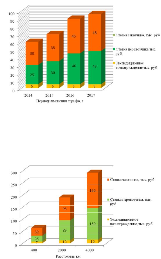 Анализ, показал, что тариф транспортных компаний на доставку груза в период с 2014 г. по 2017 г. вырос на 60 %. При этом просматривается динамика снижения доли вознаграждения экспедитора с 17 % до 10 %.