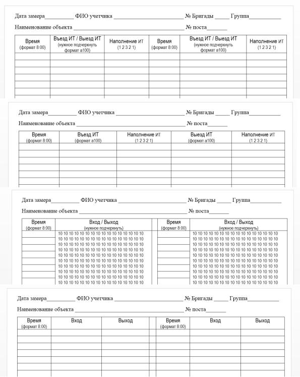 Рис. 3. Специализированные бланки учета числа посетителей территории / ЦМТ: а - учет посетителей на ИТ и наполняемость ИТ при высокой интенсивности; б - учет посетителей на ИТ и наполняемость ИТ при низкой интенсивности;