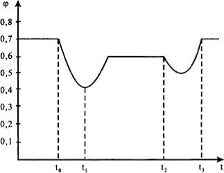 коэффициент сцепления снова уменьшается. По мере высыхания дороги грязь превращается в пыль, и коэффициент сцепления восстанавливается. Зависимость коэффициента сцепления с дорогой от продолжительности дождя показана на рис. 1, где время t0 — t1 — это начало дождя; время t1