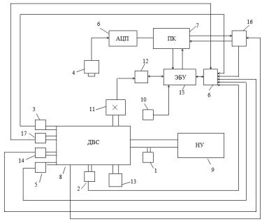 1 - датчик числа оборотов коленчатого вала; 2 - датчик детонации; 3 - датчик уровня расхода топлива; 4 - датчик давления в цилиндре; 5 - дымомер; 6 - аналого-цифровой преобразователь (АЦП);