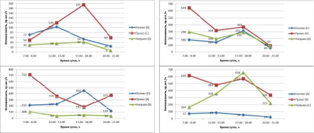 Графики изменения интенсивности движения транспортных потоков по направлениям и по времени суток были построены для каждого входа каждого из пересечений.