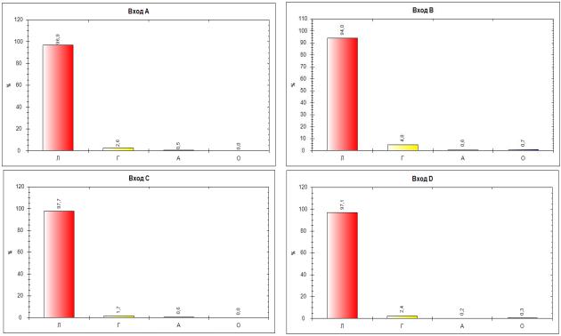 Рис. 2. Диаграммы состава транспортного потока для входов А, В, С, D |