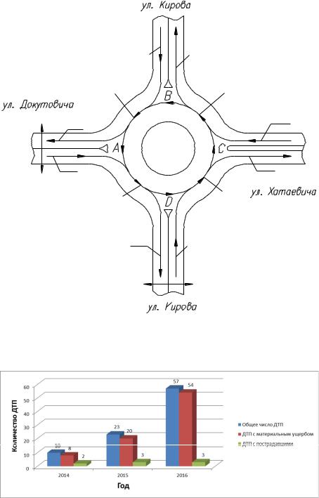 пец ф бАческ ми местами концентрации ДТП являются пересечения крупных маг стралей, городские площади и т.п. В таких местах наиболее удобным эффект вным является очаговый анализ, который выполняется в виде масштабной схемы (ситуационного плана), которая по существу является разв т ем схемы отдельного ДТП, предусмотренной карточкой учета ДТП. Каждое ДТП наносится символом, показывающим характер движения участников происшествия и тяжесть его последствий. Исследование очагов аварийности позволяет найти наиболее вероятные причины аварийности и, устранив их, резко уменьшить количество аварий и тяжесть последствий. Очаговый анализ показал, что наибольшее число ДТП наблюдается на перекрестке ул. Кирова – ул. Рогачевская – ул. Полесская, а также общее число ДТП на исследуемых перекрестках к 2016