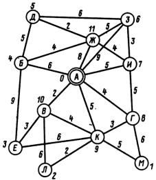 Со склада А в точки Б, В, Г, Д, Е, Ж, З, И, К, Л, М перевозят груз. Потребность в грузе: qБ = 5 т, qВ = 3 т, qГ = 2 т, qД = 4 т, qЕ = 9 т, qЖ = 7 т, qЗ