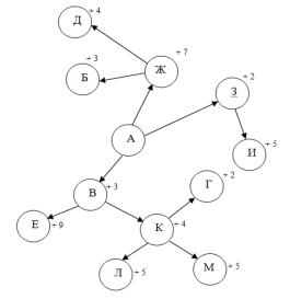 – В. Затем опять рассматриваем все звенья, которые связаны с вершиной ломаной линии Д – Ж – А – В, и из них выбираем наименьшее. Рассматривать звенья таким образом нужно до тех пор, пока не будут выбраны все вершины сетки. Кратчайшая связывающая сеть рассматриваемого примера с указанием потребности пунктов в грузе