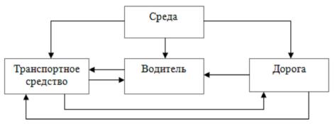 условностями можно представить состоящей из четырех основных Сэлементов: «водитель–автомобиль–дорога–среда» (ВАДС) (рис. 1).
