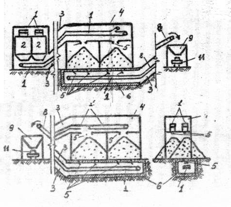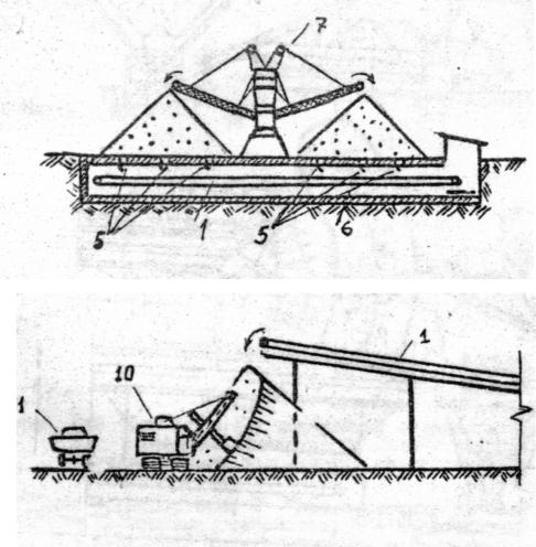 На рисунках обозначено: 1 – ленточные транспортеры; 2 – промежуточные бункеры; 3 – наклонная галерея; 4 – галерея; 5 – течки или пересыпные устройства; 6 – подштабельная галерея; 7 – консольно-поворотный конвейер; 8 – наклонный