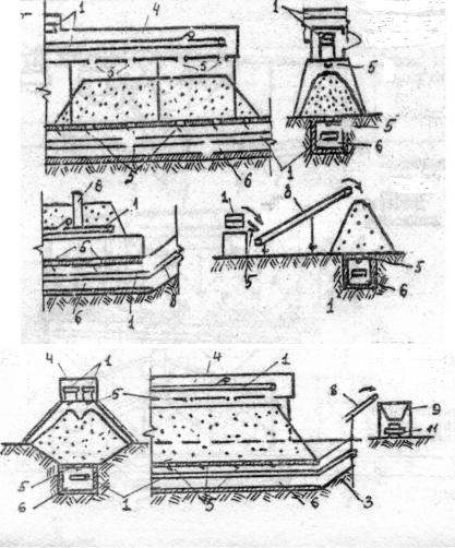 3. Для исключения загрязнения хранимого на складах материала предусматривают специальные бетонные основания или корыта глубиной 0,4–0,5 м с подсыпкой из хранимого материала.