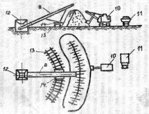 транспортер; 9 – погрузочный бункер; 10 – экскаватор; 11 – автомобиль-самосвал; 12 – приемный бункер; 13 – рельсовый путь; 14 – тележка