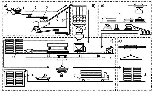 формирования и о ра отки ЖБИ; д – зона хранения и выдачи готовых изделий; 1 – пост разгрузки заполнителей; 2 – приемные бункеры; 3 – накопительные бункеры;