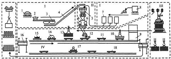 Рис. 6.5. Конвейерная технология изготовления железобетонных изделий: I – зоны |