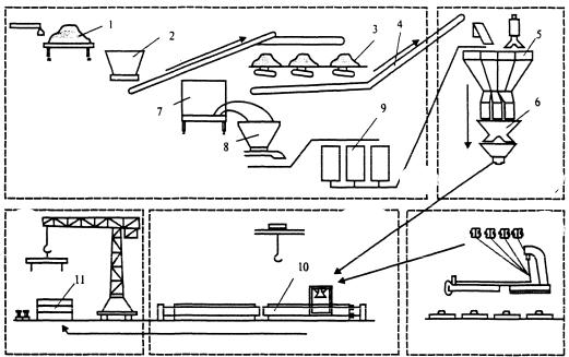 конструкций; 1 – пост разгрузки заполнителей; 2, 8 – приемные бункеры; 3 – склады каменных материалов; 4 – транспортерная галерея; 5 – расходные бункеры; 6 – пост приготовления бетона; 7 – пост разгрузки цемента; 9 – склад цемента; 10 – стенд; 11 – склад готовойДпродукции
