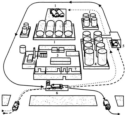 РисбА. 7.1. Генплан эмульсионной базы: 1 – установка для приема и складирования исходных материаловД; 2 – источники подачи тепла для