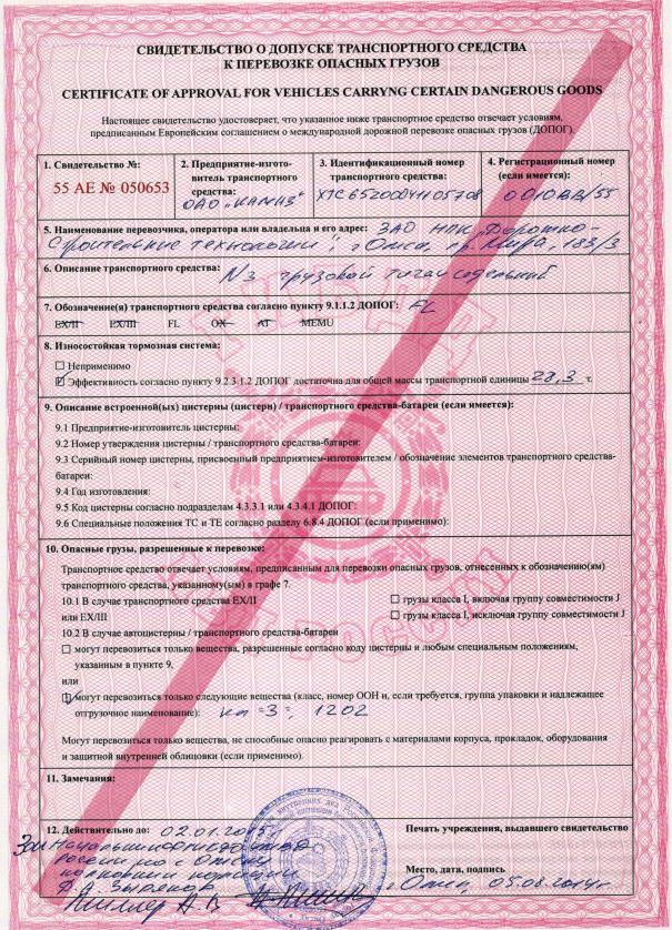 Рис. 2.20. Свидетельство о допуске транспортного средства к перевозке опасных грузов